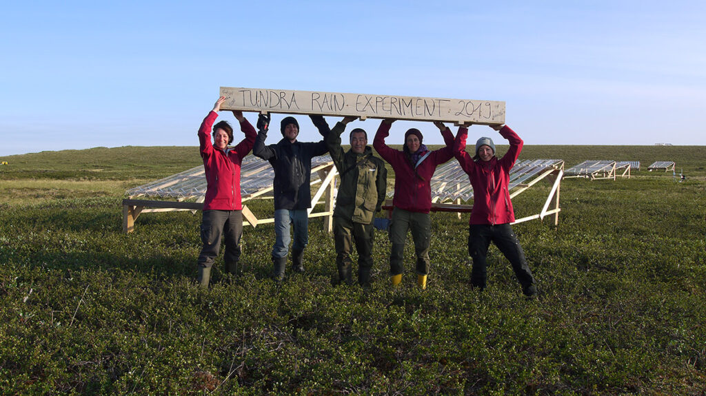 Most climate models predict large increases in temperature and precipitation in the Arctic. What does this mean for tundra vegetation, and how do changes in vegetation in turn affect climate change? In an experiment in the Siberian tundra, we measure how more or less precipitation affects the shape of plants and how this in turn affects permafrost soils. More precipitation means that the plants develop larger leaves. These, in turn, absorb more solar radiation – we therefore expect that permafrost soils will warm up less as a result. Similarly, large leaves evaporate more water than small ones. This may drain more moisture from the soils. Cool and dry conditions in the soil are better for maintaining permafrost.